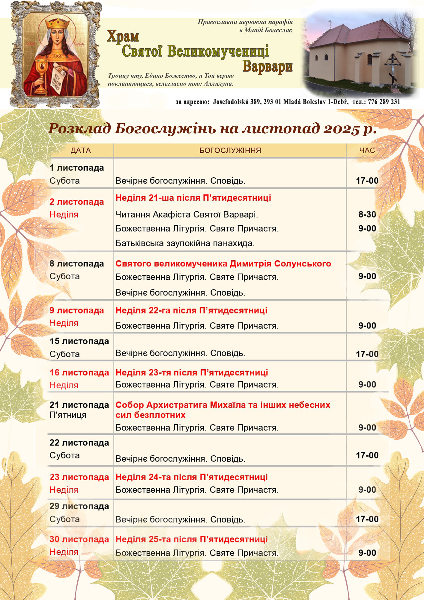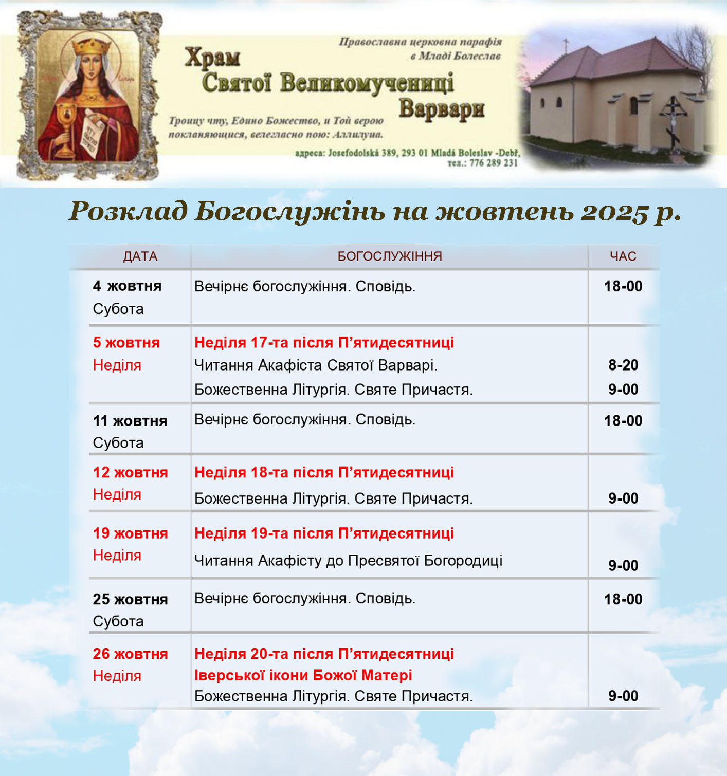 | ДАТА | БОГОСЛУЖІННЯ | ЧАС |
